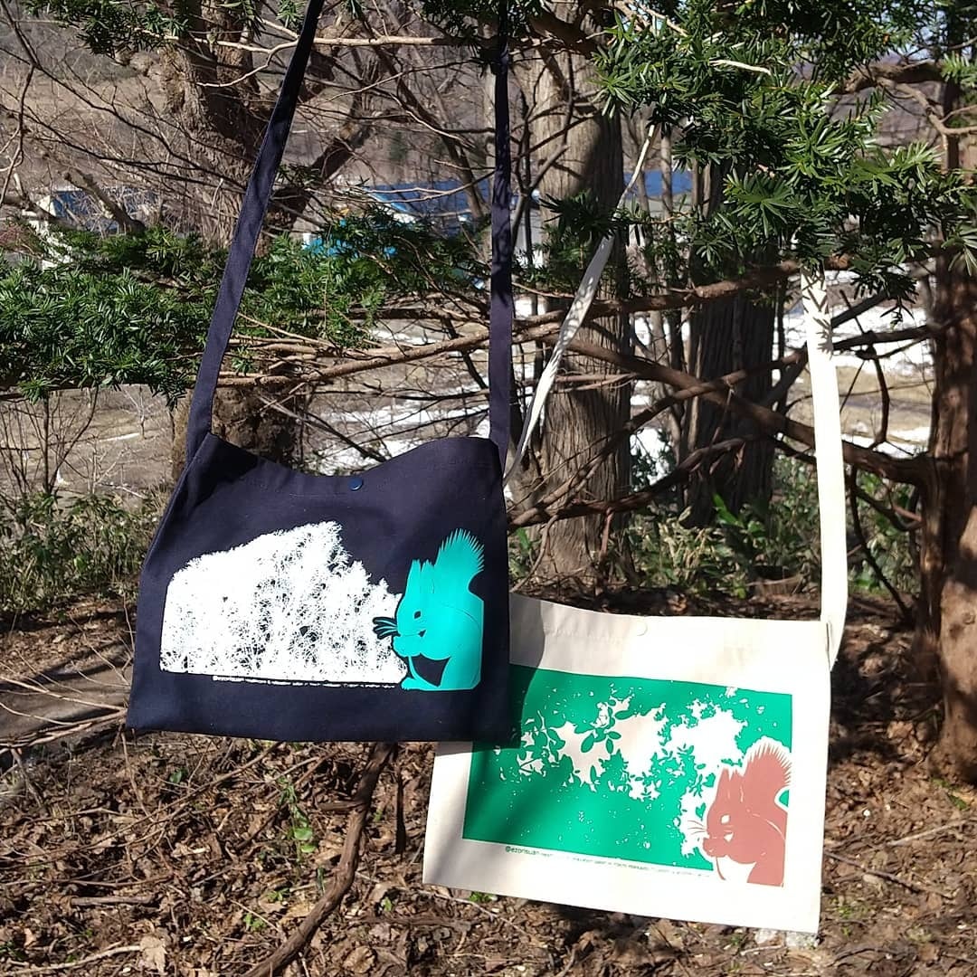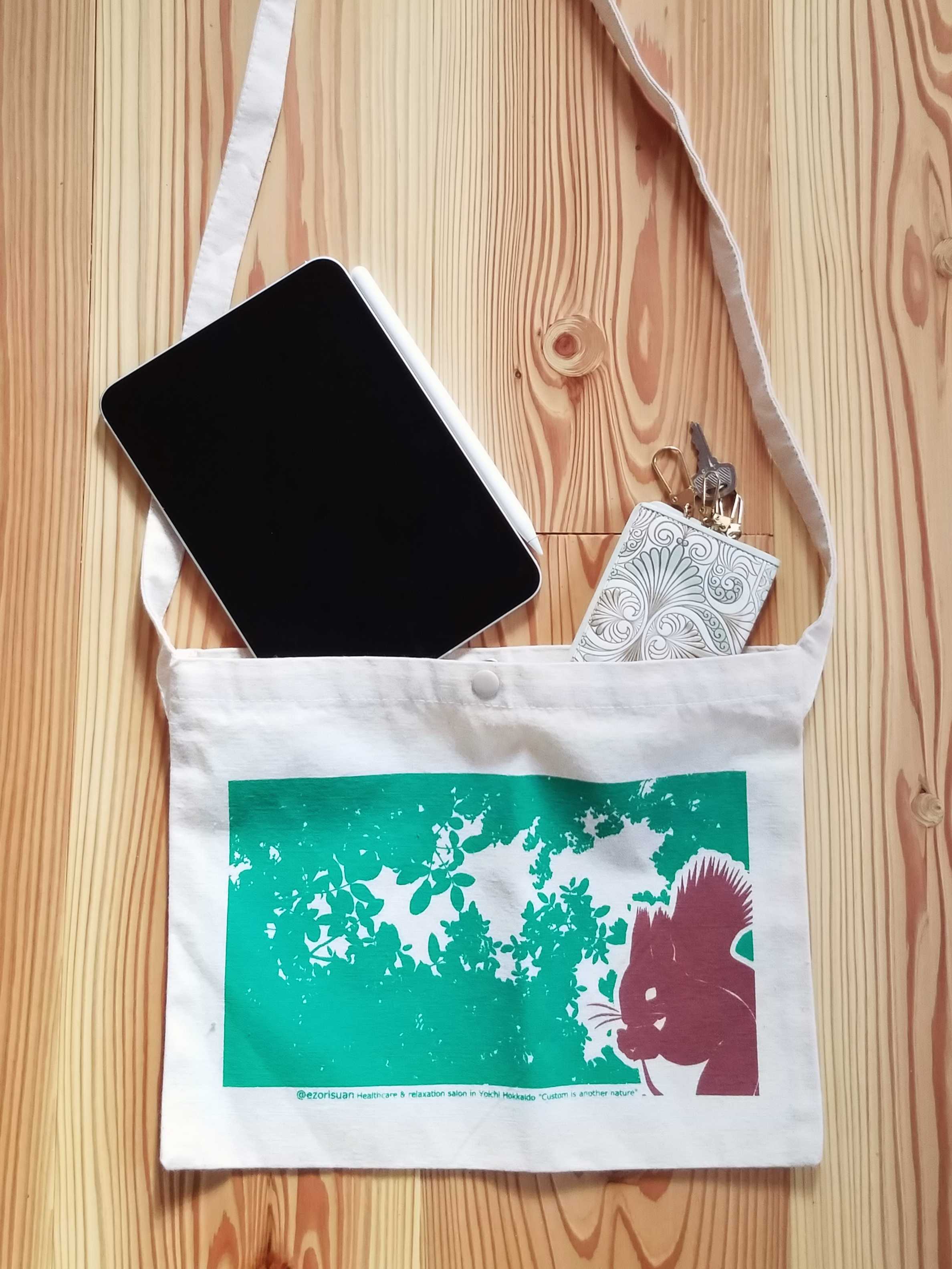 えぞりす庵のアイコンキャラクター、エゾリスと、サロン敷地内の景色を組み合わせたサコッシュです。ナチュラルは夏の景色をイメージしたデザインで、サロンの窓から見えるクルミの木をモチーフにしています。